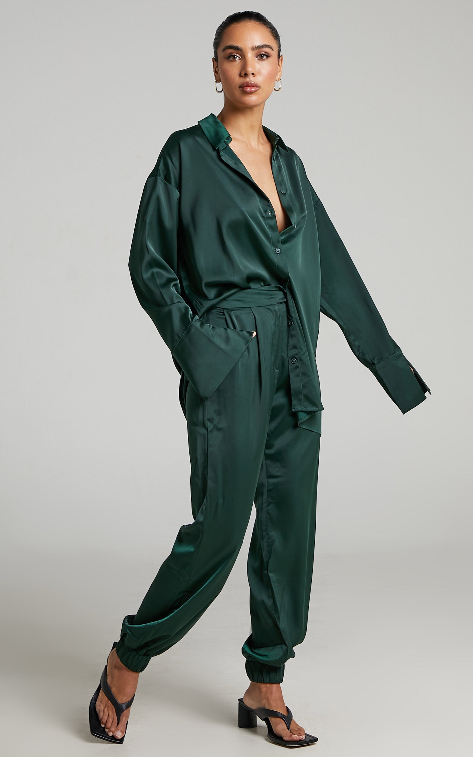 Leave a few buttons undone and half-tuck it into the 4th & Reckless - Elina Smart Satin Jogger in Forest Green for an incredible party look!