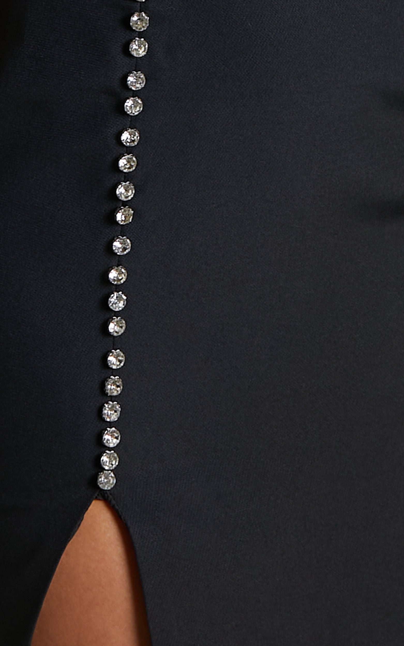The classic black mini gets an update. Take your date night look to new heights with the 4th & Reckless - Allie Skirt! This incredible mini is sleek, chic and a whole lot of glam. Featuring a high rise waist, twin mini splits, and diamante trim detail, you can team it with a black bodysuit, fine jewellery and heels for a stunning look!