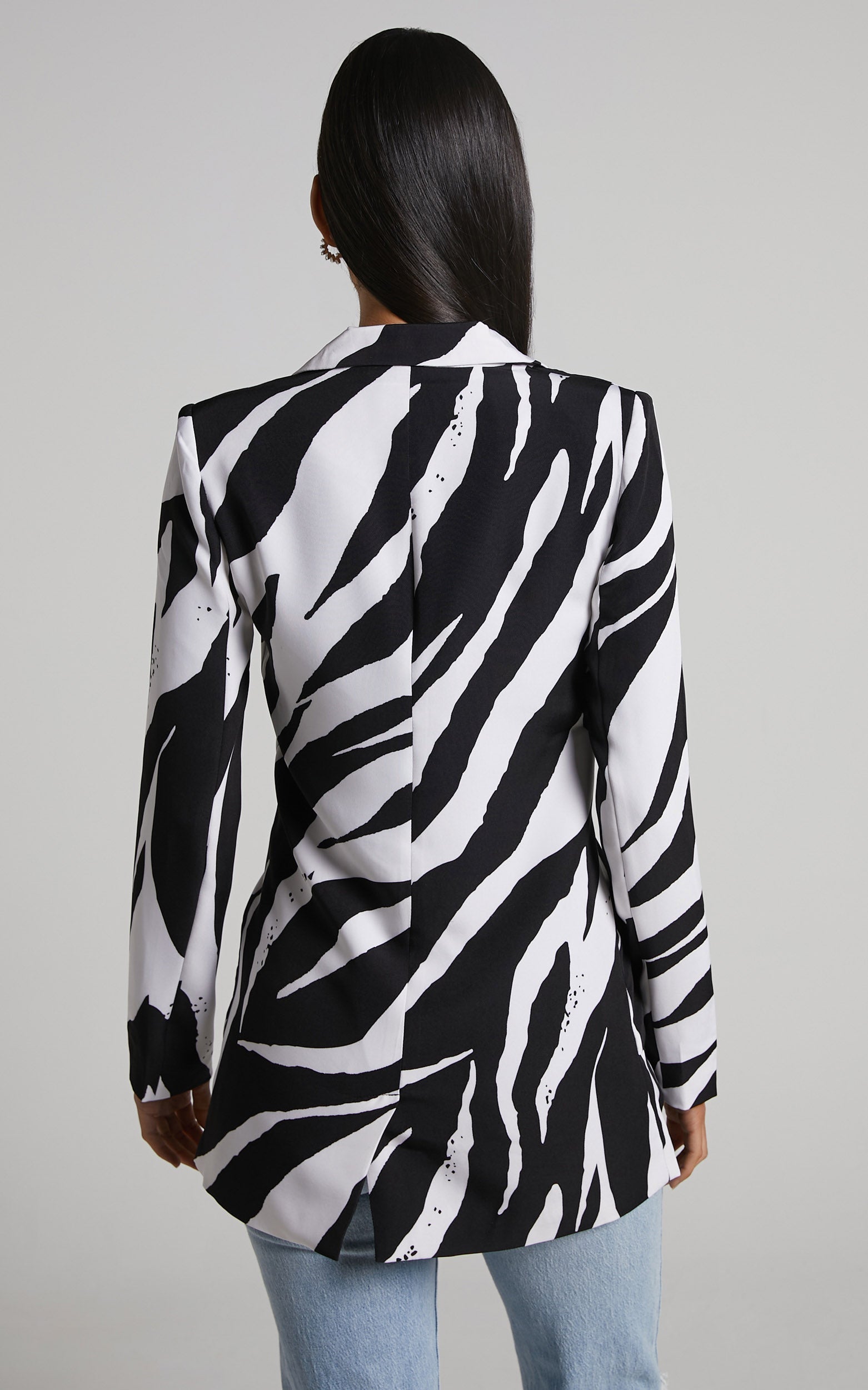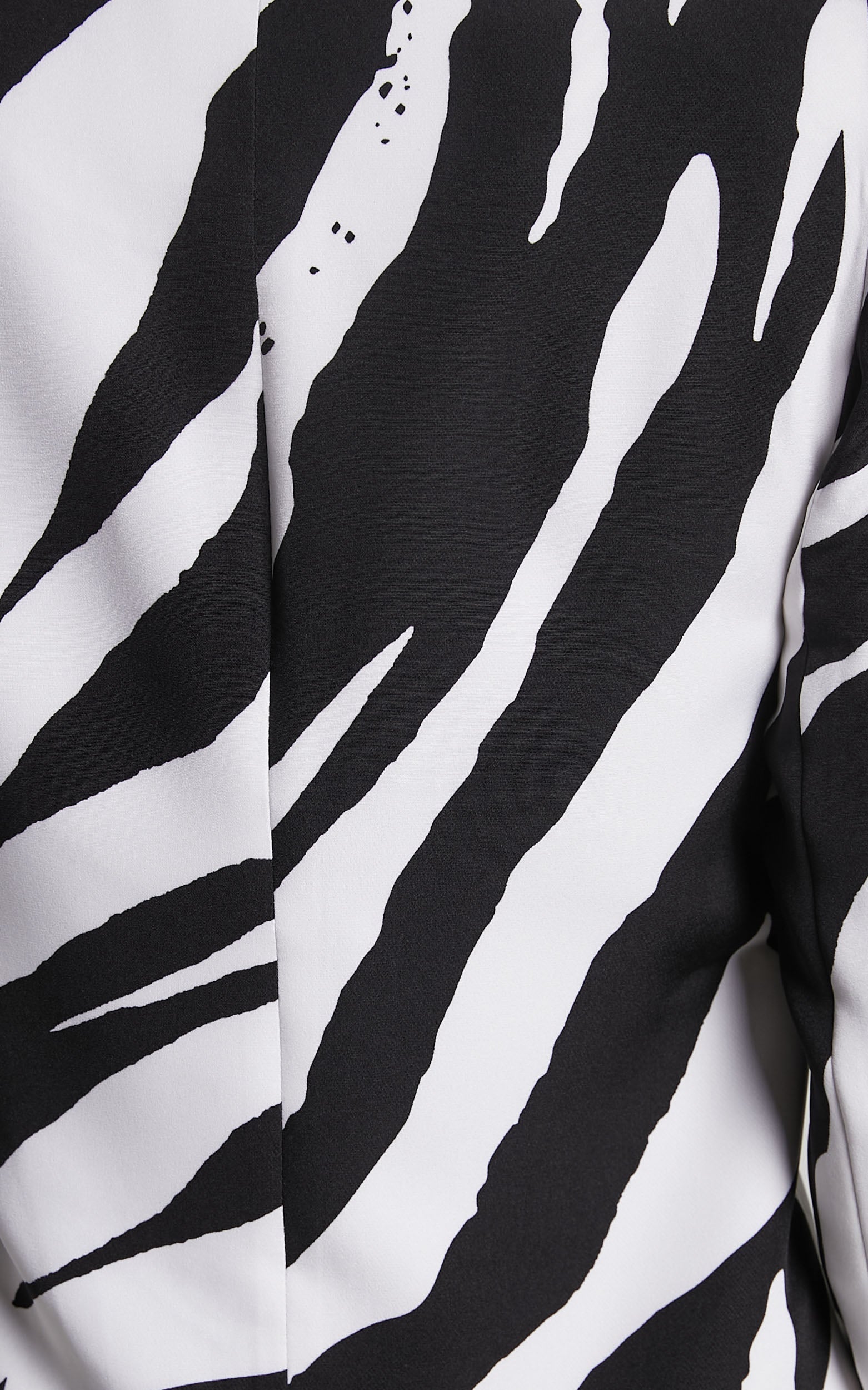 The bolder the better. Give your blazer collection a fresh update with the 4th & Reckless - Karim Blazer! This statement number features a self-tie front design, collared neckline, long sleeves and a monochromatic zebra print all over.