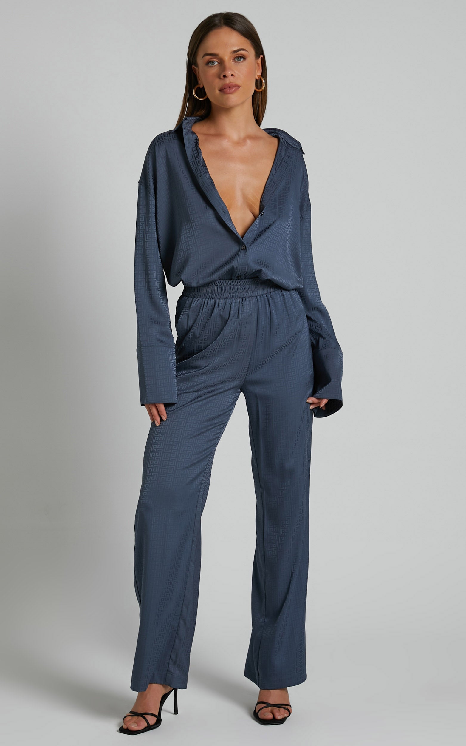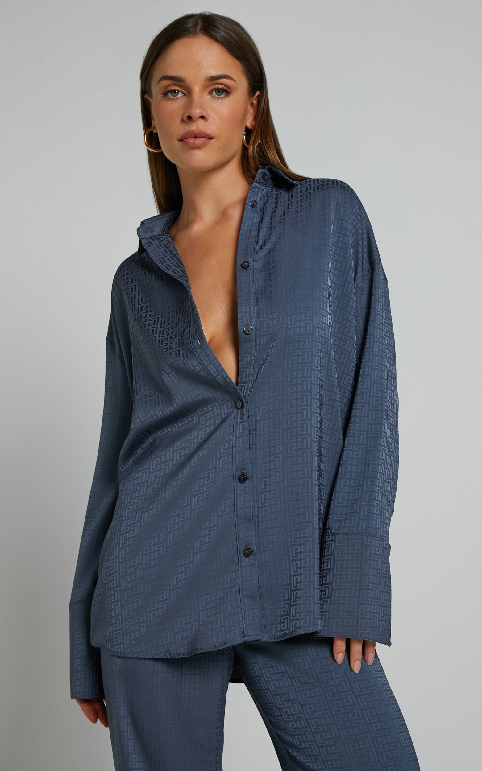 Make a statement in the 4th & Reckless Mimi Satin Shirt In Blue Geo. The bold blue geometric pattern on this navy satin top will turn heads and add some edge to your everyday casual look. Perfect for dressing up or down, this versatile shirt is a must-have addition to any fashion-forward wardrobe. Pair it with jeans and sneakers for a cool daytime outfit or dress it up with heels for a night out on the town.