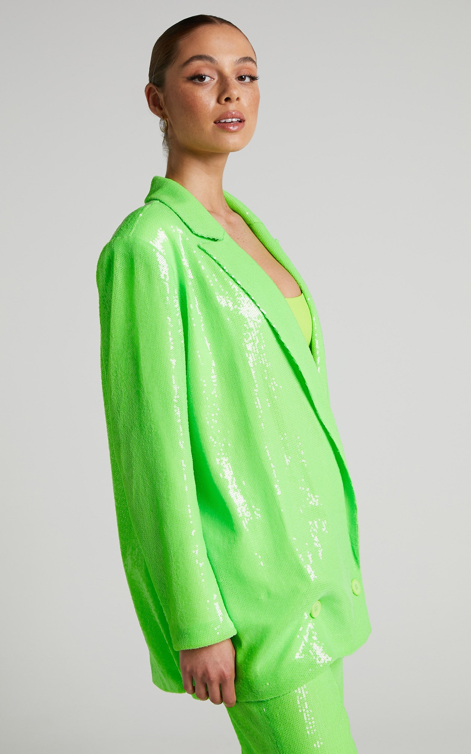 Go sequin-on-sequin by teaming it with the 4th & Reckless - Vera Trouser in Lime Sequin and the Billini - Kalie Heels in Acid for a bold ensemble!