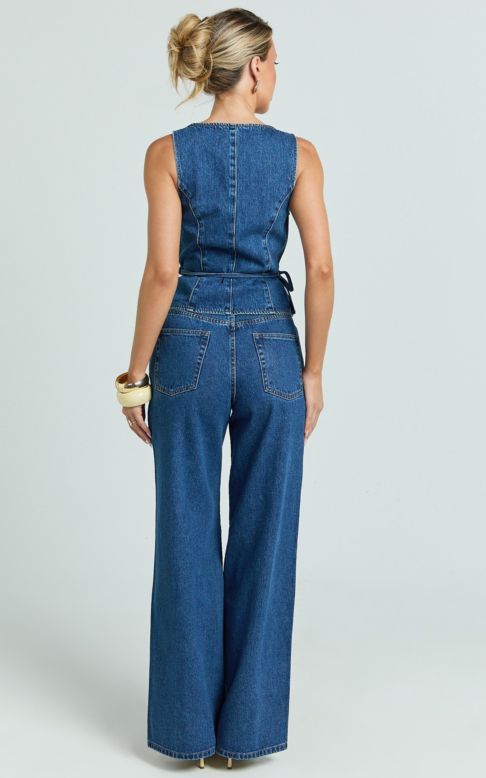 High-waist and leg-lengthening, these wide leg pleated Jeans sculpt at the waist then flow with a relaxed, confident drape. The dark mid blue wash goes from coffee runs to late-night plans without trying too hard, and the tailored pleats add polish while keeping things effortless.