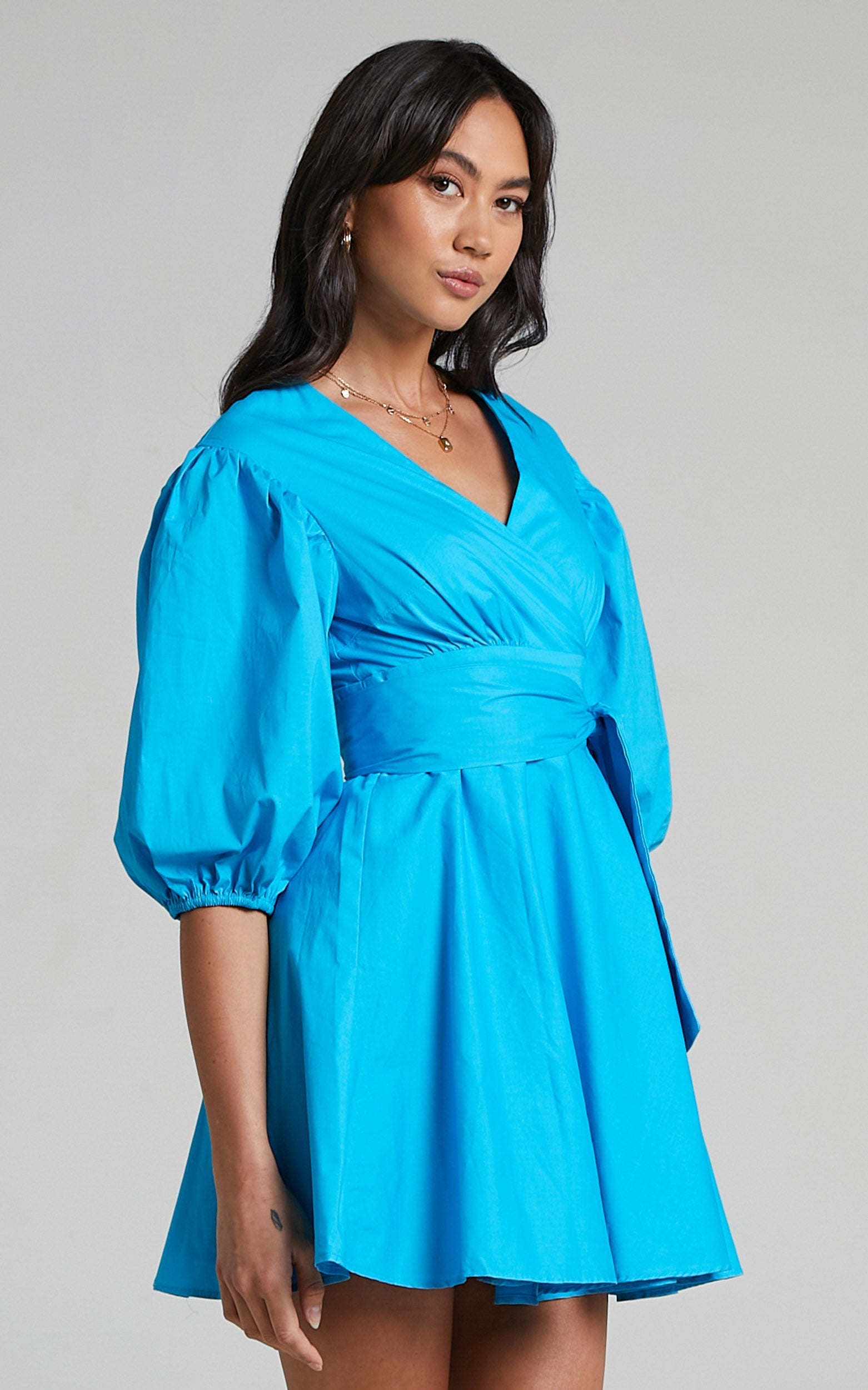 Zyla Mini Dress - Puff Sleeve Wrap Dress in Blue